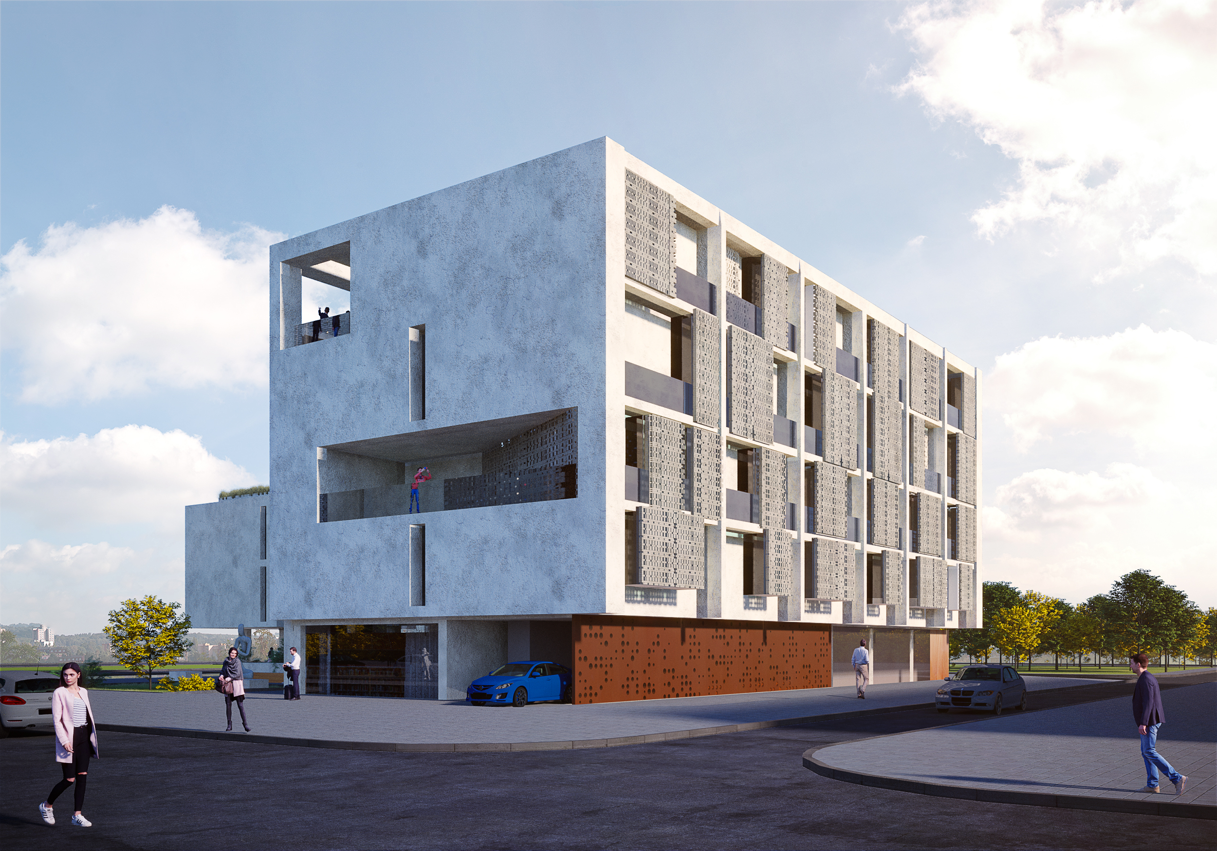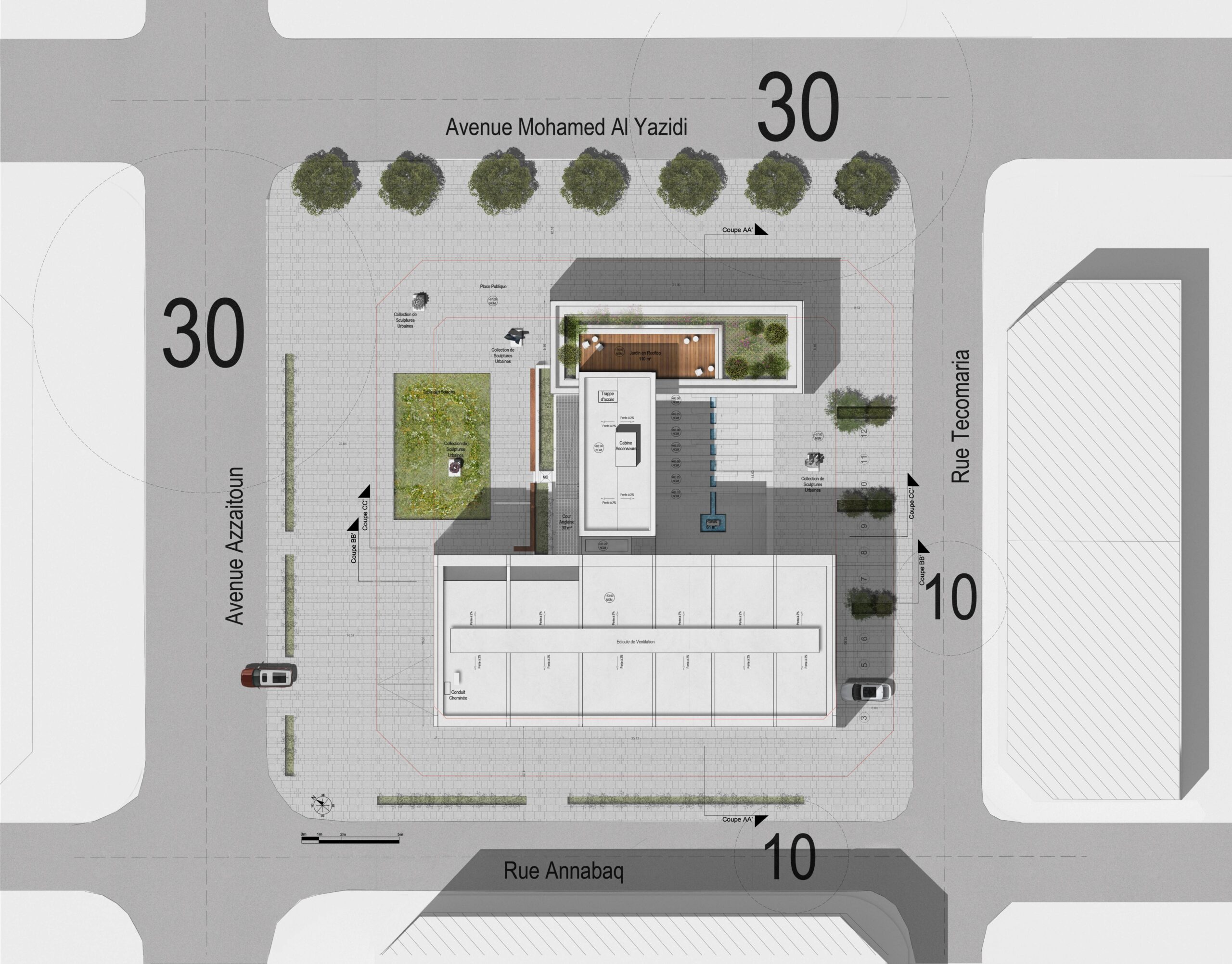 La parcelle recevant le projet profite d’une position très particulière au sein du quartier de Hay Riad. Elle se trouve en proue d’un macro-lot urbain dont la hauteur (R+4) est remarquable au sein d’un tissu urbain très bas constitué principalement de villas en R+1. D’un point de vue urbain, le projet doit assurer une transition douce entre ces deux tissus. L’îlot étant situé au croisement de voies structurantes dans le quartier, le choix a été fait de libérer les angles afin d’ouvrir l’îlot. Cela permet aux nœuds urbains de respirer. Cela donne également une impression de générosité puisque le projet se met en recul au lieu d’imposer sa présence.